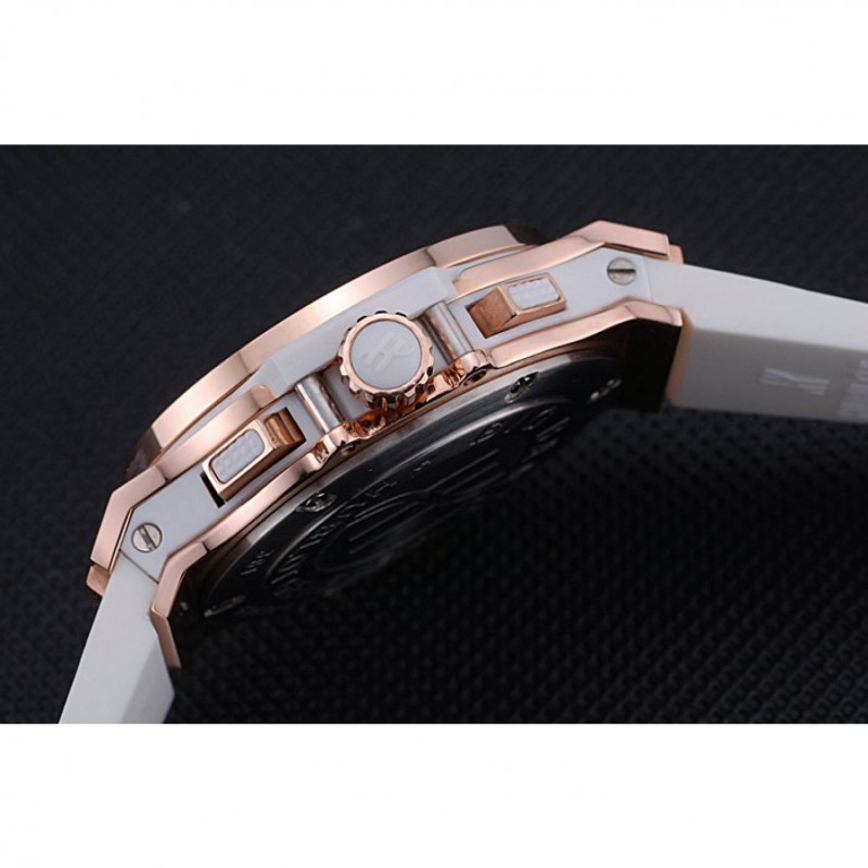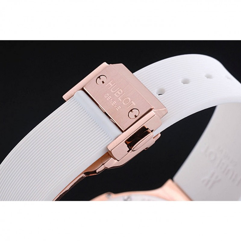 Die Uhr wird von einem hochwertigen Quarzwerk betrieben, genauer gesagt, einem japanischen Miyota Uhrwerk, das für seine Präzision bekannt ist. Mit einem Gehäusedurchmesser von 42 x 36 mm und einer Dicke von 13 mm ist diese Replica Hublot Uhr speziell für Frauen entworfen. Sie kombiniert Raffinesse mit einem modernen Flair. Besonders erwähnenswert ist das Armband, welches aus strukturiertem weißem Gummi besteht und mit einer roségoldenen Druckknopfverschluss versehen ist, auf dem die Hublot-Gravuren eingeprägt sind.